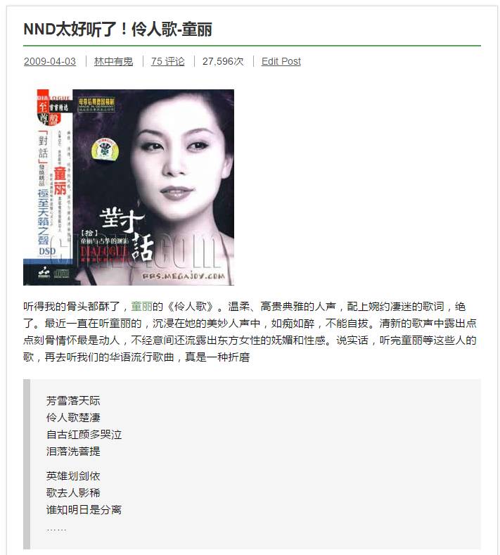2009年的,我对童丽的声音一见钟情。她出过好几张发烧唱片,也被评为过年度“十大发烧唱片”,其中《君再来Ⅳ》中以其清甜的歌声演绎了邓丽君的经典歌曲,“靡靡之音”之味依旧迷人。8年前,推荐她的《伶人歌》时我是这么说的。
