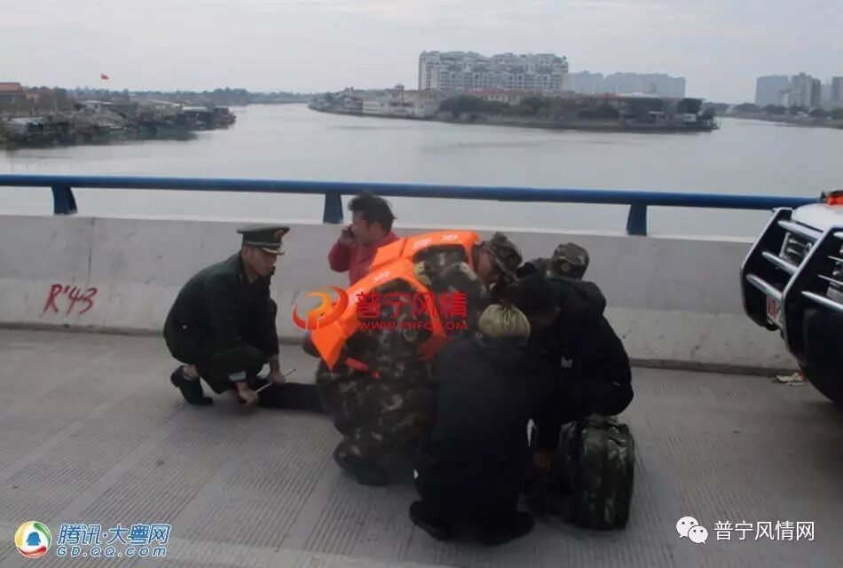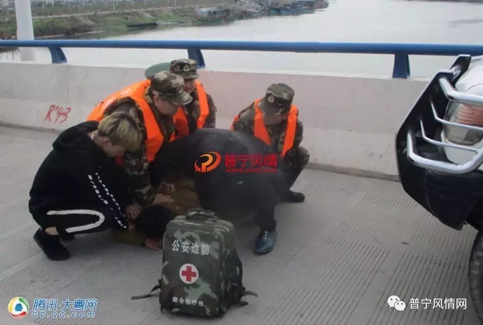 2月1日上午11点,根据110指挥中心转接的群众求助电话,汕头市新溪边防派出所四名武警官兵携带医疗包、救生衣等救援装备火速出警,在新津河入海口处的新津河桥上救下一名失恋跳海的青年男子。