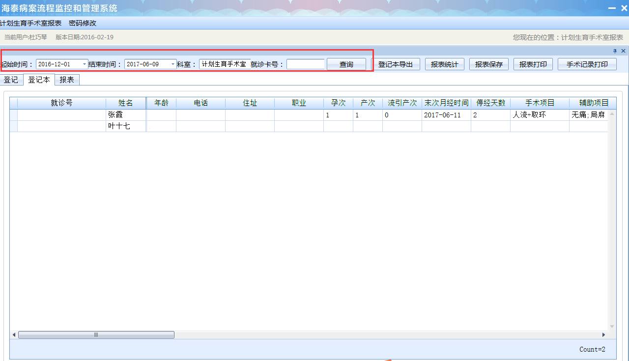 在信息登记界面输入患者的就诊卡号和预约日期可以定位到某个特定患者的手术登记情况。若在登记本界面选择起始时间和结束时间,输入患者的就诊卡号,可以统计该段时间内某个患者的手术情况,如果就诊卡号为空,就可以统计出该段时间内所有患者的手术情况。
