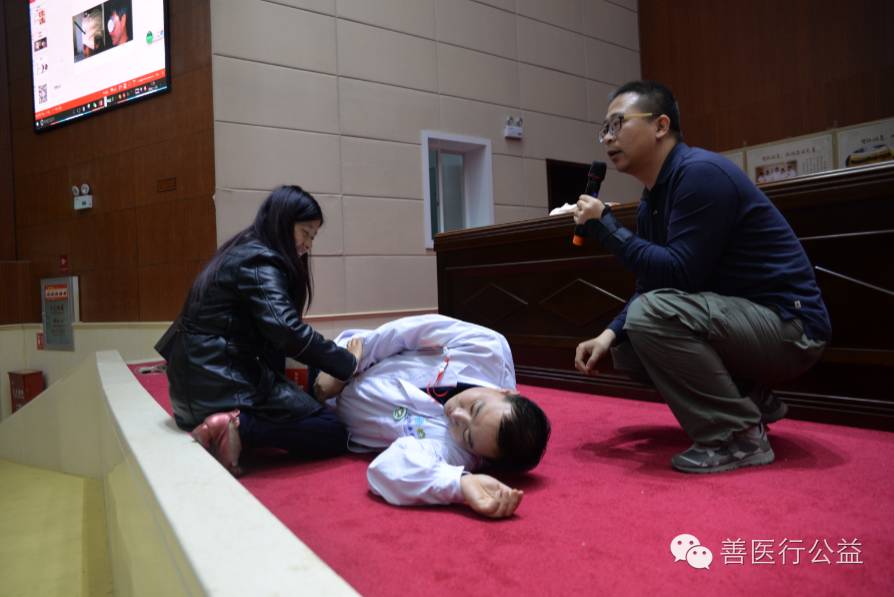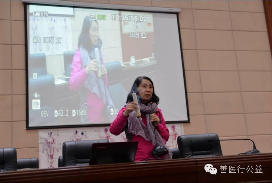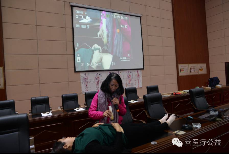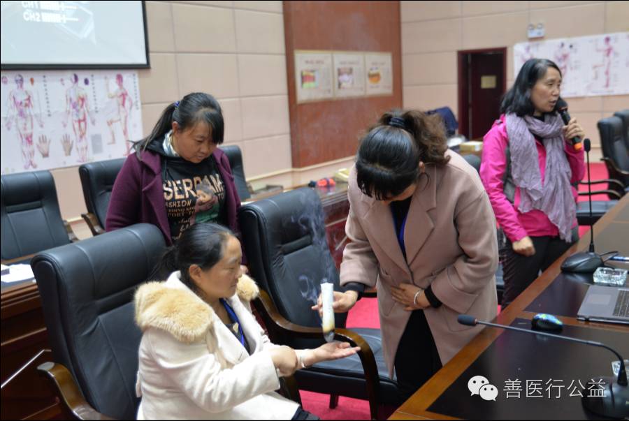 善医行梅姐还利用课余时间为学员们介绍了艾灸的疗效和基本手法,很多西医学员没有接触过艾灸,梅姐就请他们到讲台上体验,亲自为他们示范治疗,并让大家互相练习实践艾灸治疗。