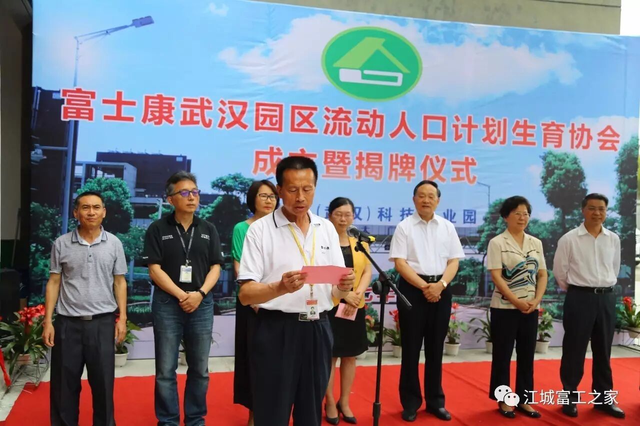 2017年5月22日下午三点,富士康科技集团(武汉)科技工业园隆重举行流动人口计划生育协会成立暨揭牌仪式。全国政协社会和法制委员会副主任、湖北省计划生育协会会长宋育英,中国计划生育协会副会长勾清明,武汉市副市长李忠,湖北省计划生育协会专职副会长张友芳,武汉市卫生和计划生育委员会主任陈红辉、东湖开发区社会发展局党委副书记、纪委书记岳枚富士康科技集团流动人口计划生育协会袁泉胜秘书长,富士康武汉园区行政服务处简荣辉处长、人资总务处张中良处长、工会郭和平主席等领导及100余名员工代表共同见证了这一重要时刻。