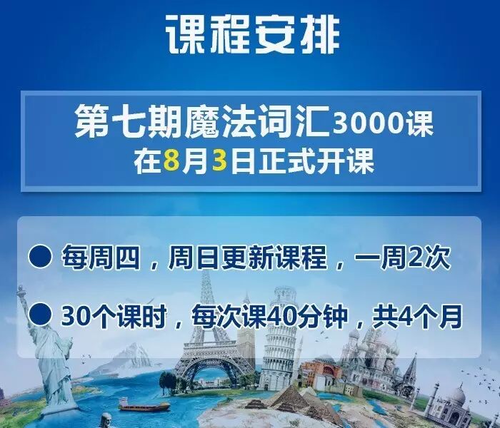 我们的第七期魔法词汇课程为期4个月,每周四,周日推送一次课程,一共30次精心录制课程。