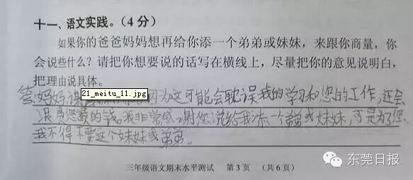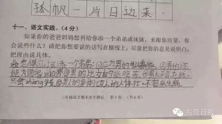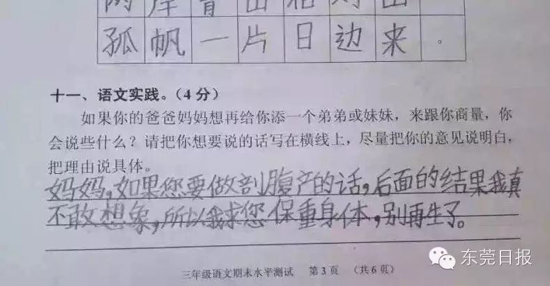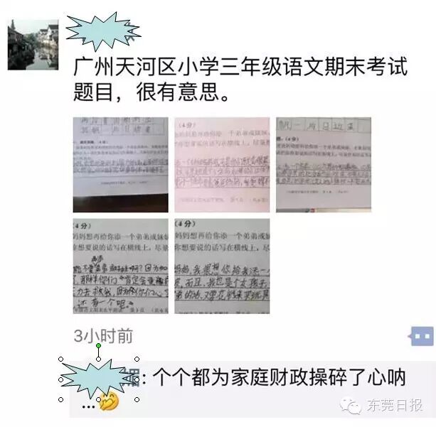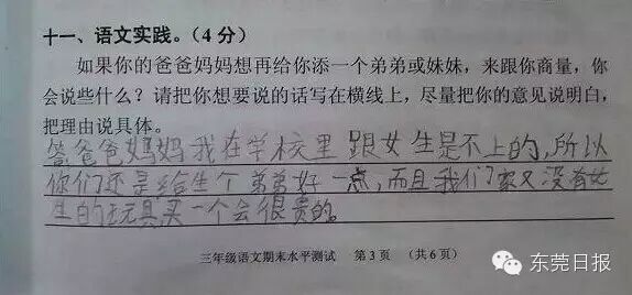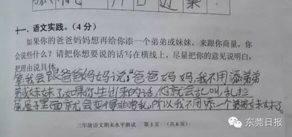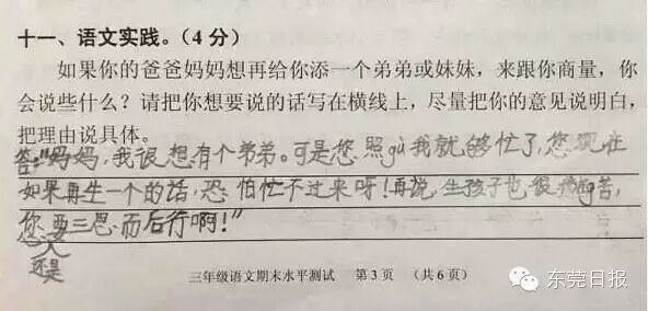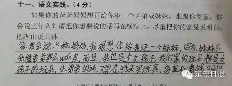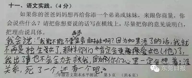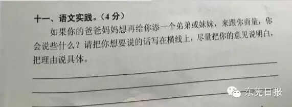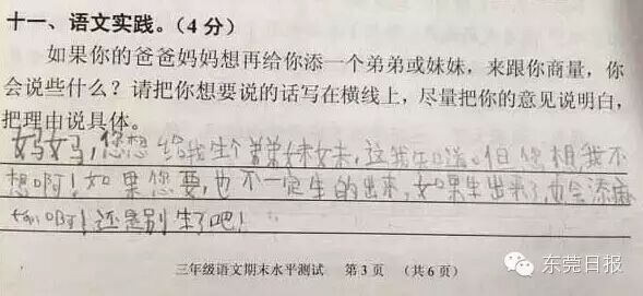 今天上午,广州一小学期末考的一道有关“父母生二孩,老大怎么说”的考题迅速在网上走红,这不仅是这道朴实而走心的题目受关注,孩子们五花八门的答案更是赚足眼球。