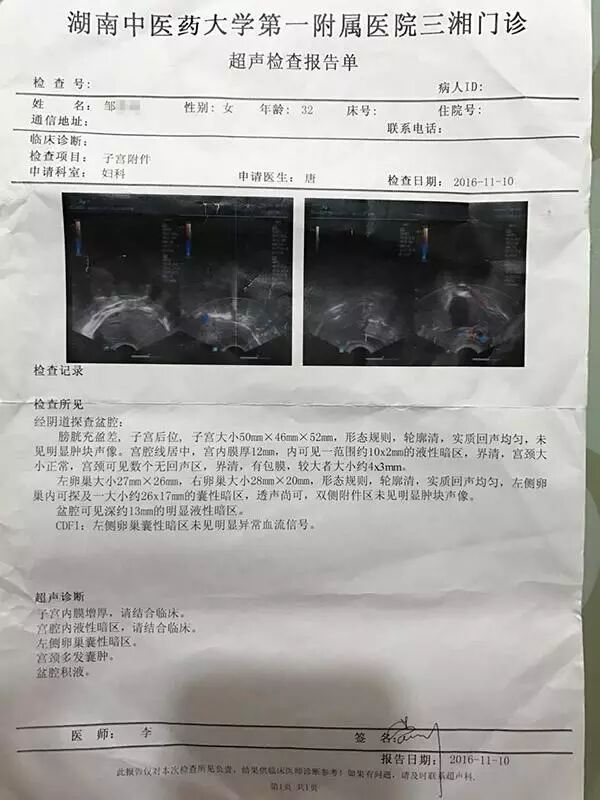 邹女士提供的长沙市妇幼保健院医院病历显示,她此前服用的药物有“导致流产和致畸的风险”。邹女士提供的三湘门诊病历、超声检查报告单等材料显示,11月10日、19日、26日,她先后三次到该医院就诊。超声检查检测结果为,子宫内膜增厚,宫腔内液性暗区,侧卵巢囊性暗区,宫颈多发囊肿,盆腔积液。