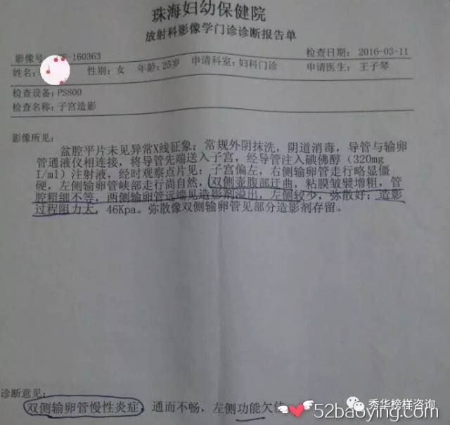 所以2015年春节刚过,小叔要回珠海上班,公婆强烈要求让小婶也一起去珠海工作,两人在一起生活就可能性大些。就这样他们在珠海又过了大半年还是没有动静,眼看结婚又要两年整了。这时候刚好小姑子使用葆婴产品调理月经不调,改善的效果很好,家婆也想开始调理高血压和高血糖。就劝说小叔夫妻也来调理身体备孕。就这样2016年春节他们回家,就开始吃葆婴产品备孕。 但因为从14年8月我开始经营葆婴,小婶就想买产品去备孕的,但小叔非常反对,也就不了了之了,现在他们要吃了,虽说是备孕,但公婆的意思非常明显是要抱孙,所以我建议他们至少应该去检查一下身体,确认情况是怎样的,大家也比较有底,不然小叔肯定有话说。所以节后回珠海后就有去医院检查,结果是小婶的双侧输卵管慢性炎症,通而不畅,左侧功能欠佳。医生说要做手术。这个微创手术做完之后一年内可能怀孕,如果一年内还不能怀孕的话,那就只能做试管了。