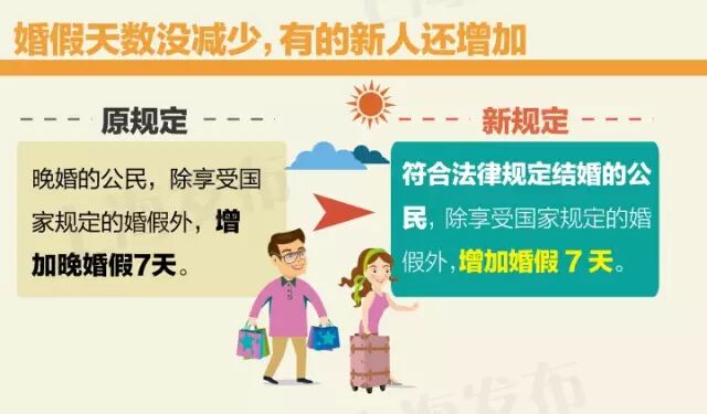 符合法律规定结婚的公民,除享受国家规定的婚假外,增加婚假7天。所以,对很多原本属于“晚婚”年龄的人来说,“晚婚假”只是改了个名字,并没有变化;而对于一部分原本无法享受晚婚假的新人来说,假期还增加了。