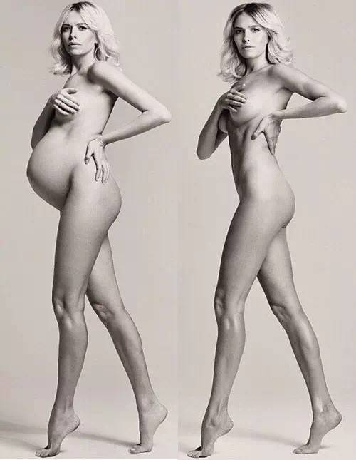 左边是普通怀孕7个月,右边Sarah Stage怀孕8个月肚子却紧实几乎无脂肪