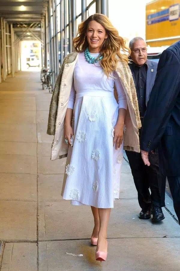 说到这里不得不提下Blake Lively。当年她怀孕时穿着斗篷装的照片登上各大时尚头条。孕肚看不到,时髦又青春洋溢!