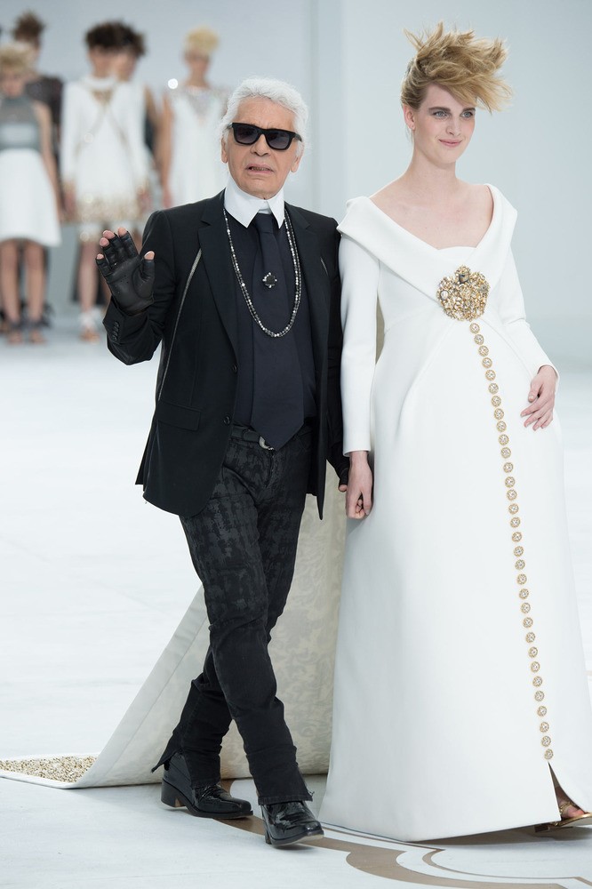 2014年7月8日,Chanel于巴黎高定时装周发布2014年秋冬高级定制系列。怀孕7个月的超模Ashleigh Good作为这一季的Chanel新娘,以一袭极尽奢华的白底金边刺绣礼服,携手老佛爷Karl Lagerfeld惊艳压轴出场,成为全场最大的亮点!