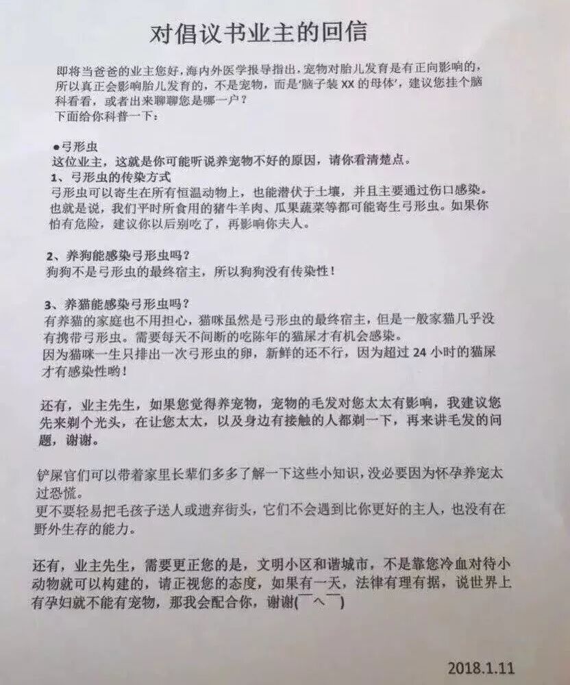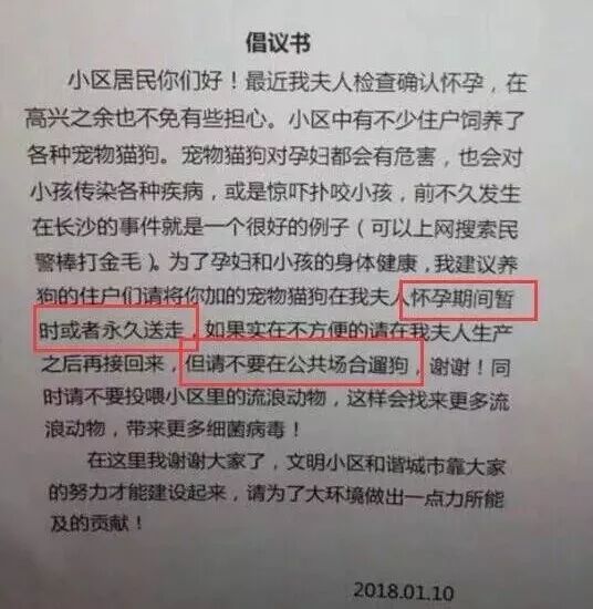 怀孕跟养狗到底冲突不冲突,自己难道不会去查?为了保护家人就呼吁全小区的人丢弃“伴侣家人”?自己无知也就算了,还要把全小区的智商拉下水?