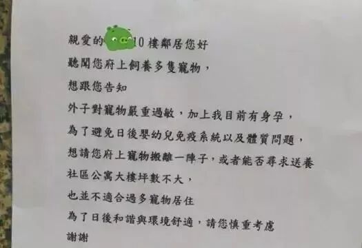 邻居怀孕后,以他家宠物太多为由,“为了避免的婴幼儿免疫系统和体质出现问题”,希望他能把宠物送走...