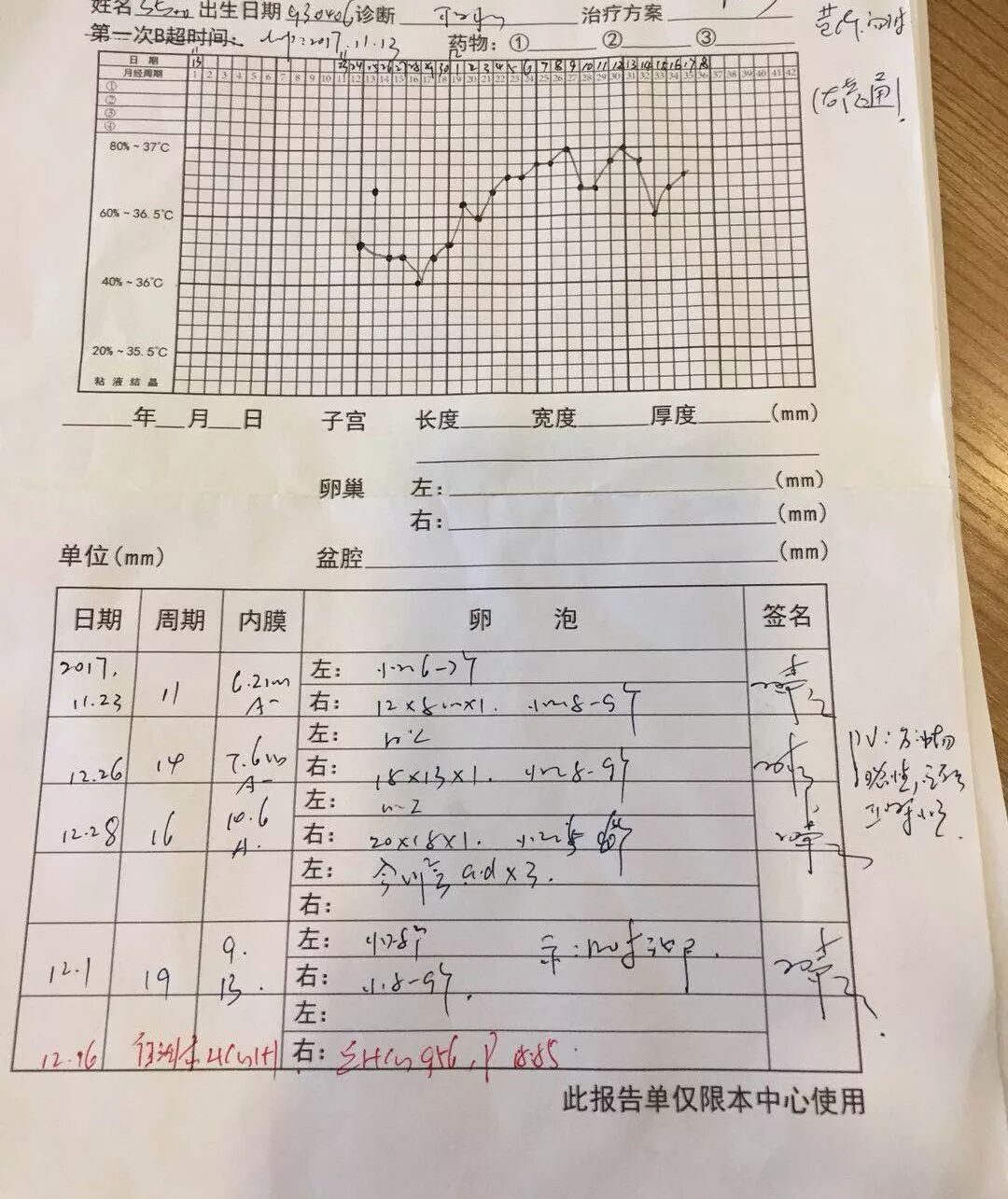 半年前,小李因为婚后3年不孕、输卵管不通行腹腔镜下输卵管成型术,术后2月自然怀孕,随后介绍了她的表弟媳妇小张过来。小张几年前因为宫外孕切除了左侧输卵管,此后难以怀孕,上个月当地造影右侧输卵管也不通了,过来后要求直接腹腔镜。排除手术禁忌症后8月底我们为其施行了宫腹腔镜手术,果真右侧输卵管间质部梗阻,腹腔镜监视下经宫腔镜插入导丝,顺利疏通。次月即备孕,2月未孕。为了精准指导受孕,决定为其超声监测排卵,同时她自己进行基础体温测定。末次月经11月13日来潮,第10天开始监测,发现正好右侧卵巢发育卵泡,第16天发育成熟,激素呈现即将排卵,基础体温呈现最低点,简直跟教科书描述的一模一样,安排同房,3日后监测已排卵,半月后月经未来潮,自测尿试纸条两条红线,血hcg956,正式宣告怀孕。下面的图片证实了这个过程。只等再过半月排除宫外孕......