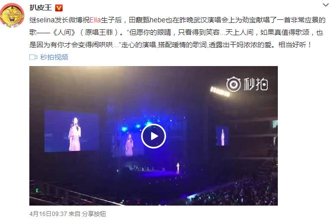 在4月16日的武汉演唱会上Hebe为Ella的宝宝献唱了一首《人间》,“但愿你的眼睛,只看的到笑容......”,一曲唱完,台下的粉丝都感动到泪流。