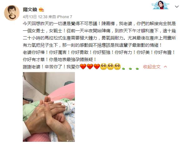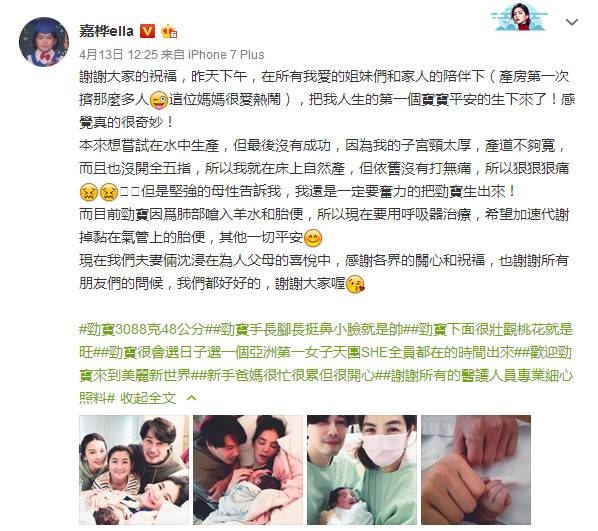 和大多孕妇一样,Ella的这次生育也经历了非人般的疼痛。但是地表最强孕妇的称号岂是虚名,据selina微博所述,Ella是她见过最勇猛最不怕痛的人,宫缩的时候还和她们一起唱着歌。