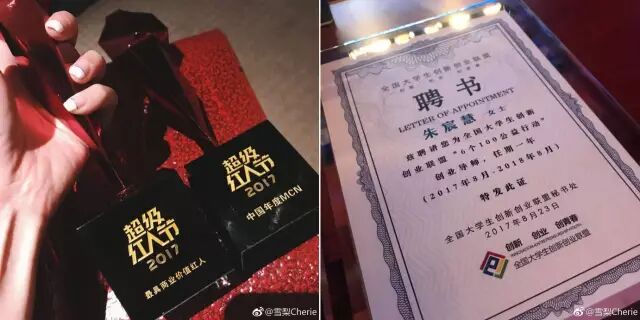 还被浙江大学聘请为创业导师,微博也颁发给她年度红人机构和最具商业价值红人两项大奖。