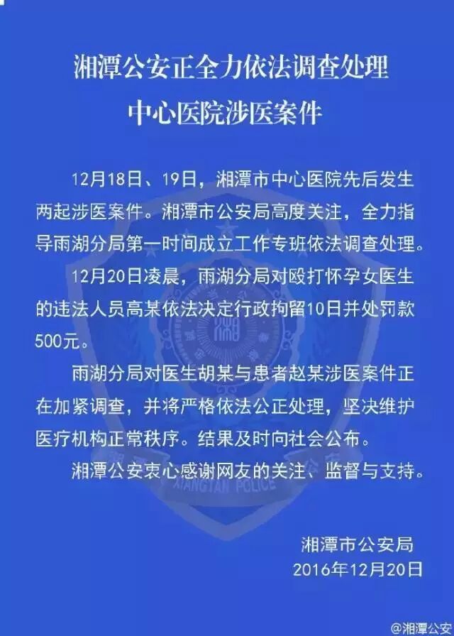 12月20日上午11:38湖南省湘潭市公安局官方微博发布案件审理结果:12月18日、19日,湘潭市中心医院先后发生两起涉医案件。湘潭市公安局高度关注,全力指导雨湖分局第一时间成立工作专班依法调查处理。12月20日凌晨,雨湖分局对殴打怀孕女医生的违法人员高某依法决定行政拘留10日并处罚款500元。
