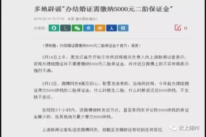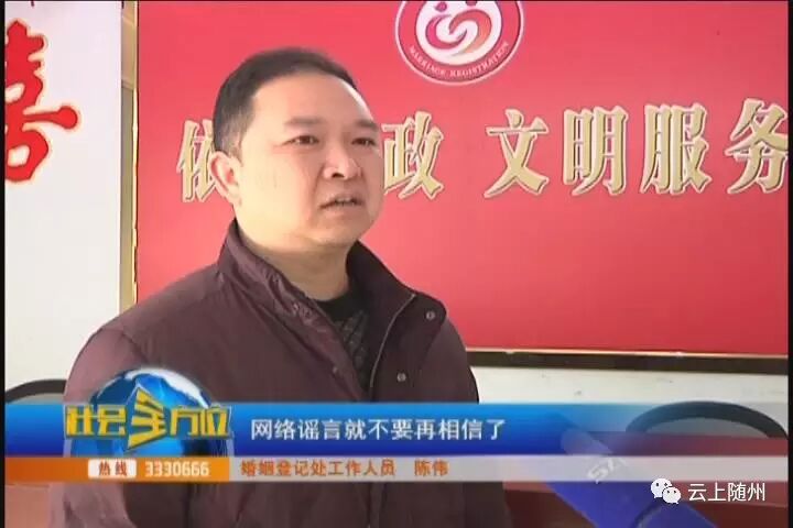 【采访】市民政局社会福利社会事务科科长 彭琳:现在领取结婚证已经不要工本费了,这个政策从2016年11月1号起已经执行了。领结婚证要交二胎保证金5000元等等,这都是谣言。可以打114问(婚姻登记处)电话,随县,曾都,广水婚姻办事处的电话都是公开的,所以呢,不要轻信谣言,要去核查它。