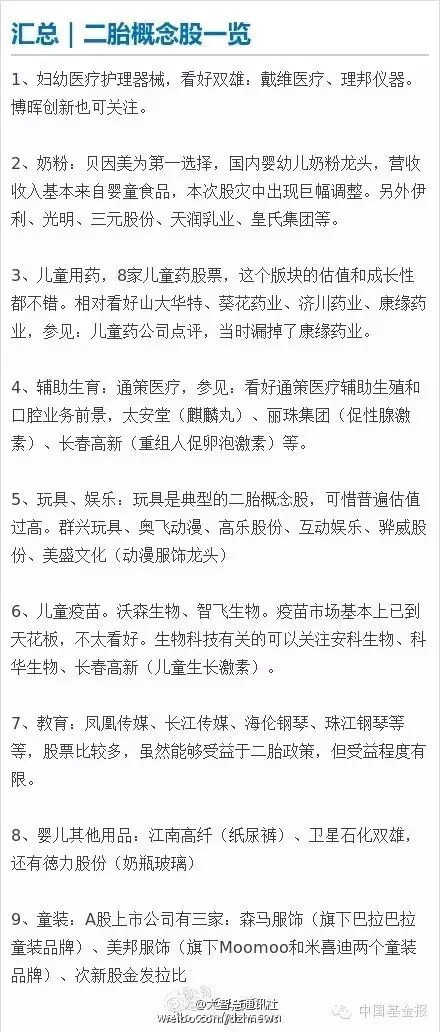 其中体的有博时医疗保健(050026)、富国医疗保健(000220)、易方达医疗保健(110023)概念比较直接,毕竟生孩子总需要增加医疗保健支出。