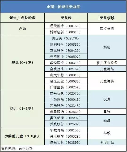 民生证券认为,在新生儿成长的不同阶段,各消费行业将受到需求支撑。从消费角度看,新生儿的大幅增长将扩大居民消费,依据年龄增长,食品、衣着、教育文化娱乐、家庭设备用品、交通和通信、医疗保健等支出将陆续增加,相关行业需求将相继提振。