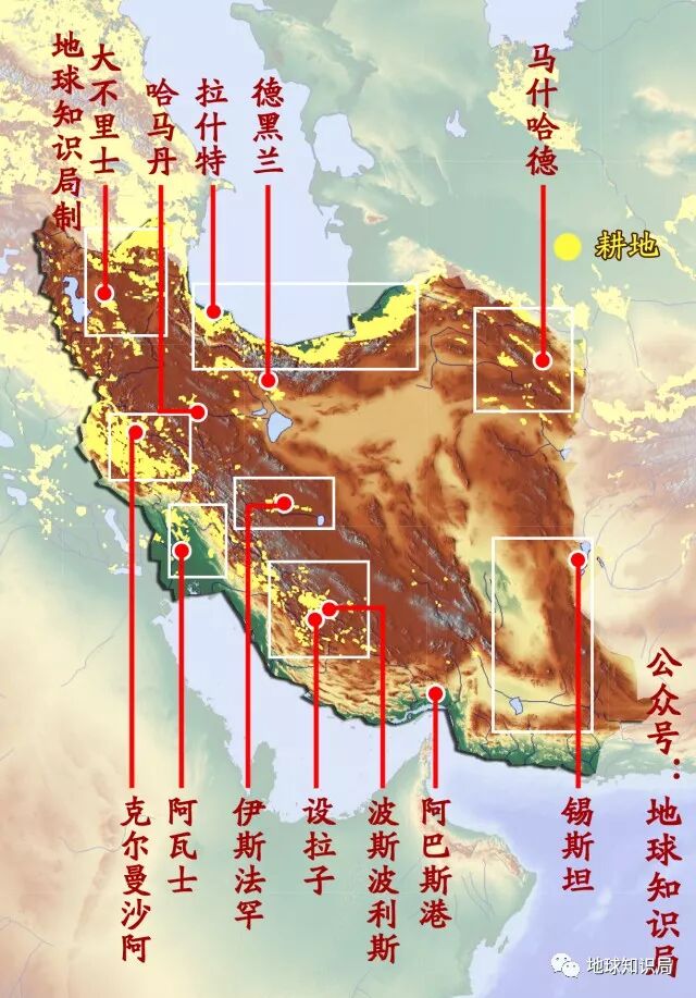 伊朗的耕地与主要城市分布