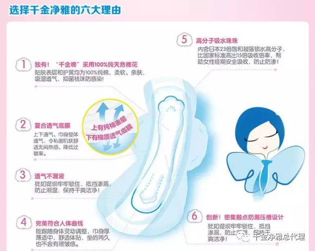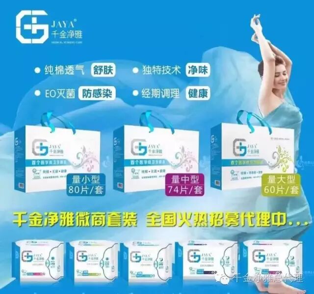 欢迎加入千金净雅大家庭,V信号kanshu68主要产品:千金净雅妇科专用卫生棉、千金净雅产妇包,产品特点:100%纯棉、0真菌0细菌(药械级别的卫生标准)、预防妇科疾病发病率、行气化瘀。我们有最优秀的团队,最专业的培训,期待你的加入。
