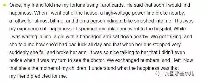有一次,我的朋友用塔罗牌给我算命,他告诉我说,我马上就会找到幸福。