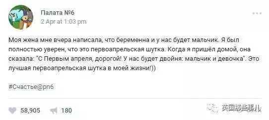 “老公,愚人节快乐!之前说怀了个男孩是骗你的。我其实怀了龙凤胎,一个男孩,一个女孩。”