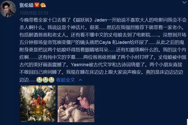 昨晚,这个充满爱的家庭在张伦硕的组织下,全家老小出动去看了场电影:“今晚带着全家十口去看了《猫妖转》Jaden一开始说不喜欢大人的电影问我会不会杀人啊什么。我说这是个神话片。很美......然后在我强烈推荐下就带着一家老小。包括醉酒爸爸和老丈人。还有看不懂中文的丈母娘去到了电影院......。