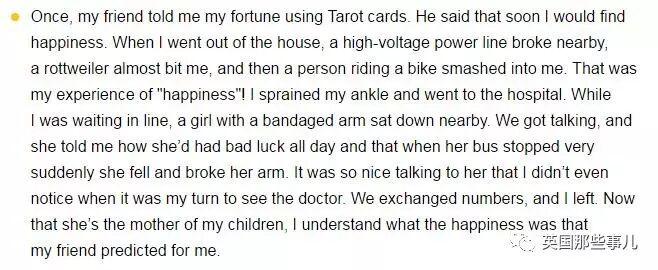 “有一次,我的朋友用塔罗牌给我算命,他告诉我说,我马上就会找到幸福。