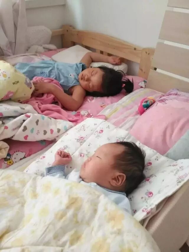 【小土注:出于安全的考虑,最好还是让婴儿睡单独的小床,有条件的可以考虑提前给老大分房,避免相互干扰,图中的床上杂物、被子等比较多,有安全隐患。】