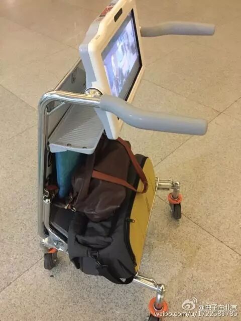 @虫子在北京:从来没见过青岛机场这么令人发指的手推车。设计者在手推车上面留下的空间小到只够放一个钱包,而且还很奇怪的认为旅客在走向登机口的路上会抽空看个电视广告。