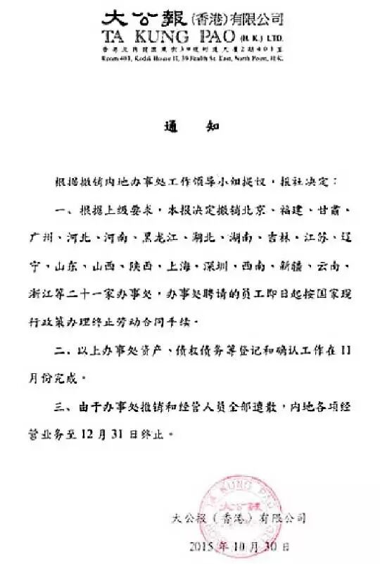 有北京传媒人在微博贴出《大公报》在上月30日的通告,指该报撤销中国内地各省市21间办事处,在内地各项业务至12月31日终止,并遣散全部办事处员工,即日起办理终止劳动合同手续。