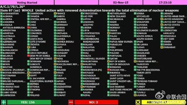 @联合国:[裁军事务]联大第一委员会刚刚以156票赞成、3票反对和17票弃权的表决结果通过了题为“再次下决心采取联合行动彻底消除核武器”的决议草案。中国、朝鲜、俄罗斯投了反对票。美国、英国、法国等17国投了弃权票。中国对决议中有关广岛、长崎核爆炸70周年和邀请各国领导人和青年访问上述两城市表示异议。