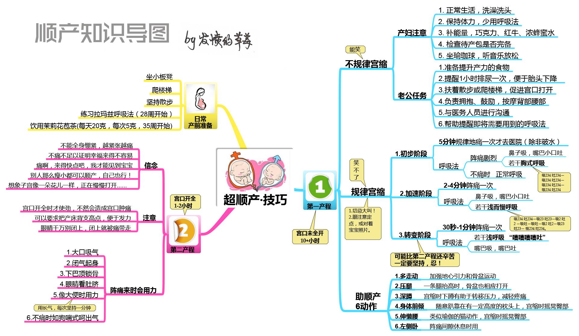 在花了大量时间寻找“顺产”内容的过程中,我发现相关的知识点非常零散,当年没有见到任何一篇全面介绍减痛分娩的文章,于是顺手把了解到所有顺产知识归纳成一张导图(2年前的事)。凡是身边有姐妹要生娃的,我都会把这种导图作为礼物送给她。