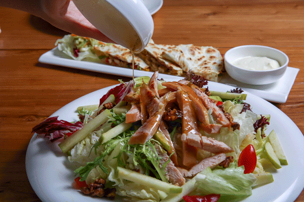 沙拉界的黑马,火鸡胸肉沙拉,火鸡胸肉、生菜、番茄铺的满满当当.... 淋上搭配的蜂蜜柠檬汁,淡淡的甜味简直像是迎着海风的夏天~~~~