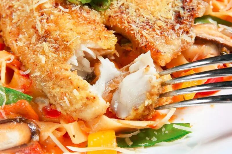 叉起一块,雪白厚实的鱼肉完全没有鱼刺,入口外脆里嫩,仿佛能听到牙齿咬下的擦擦擦声....