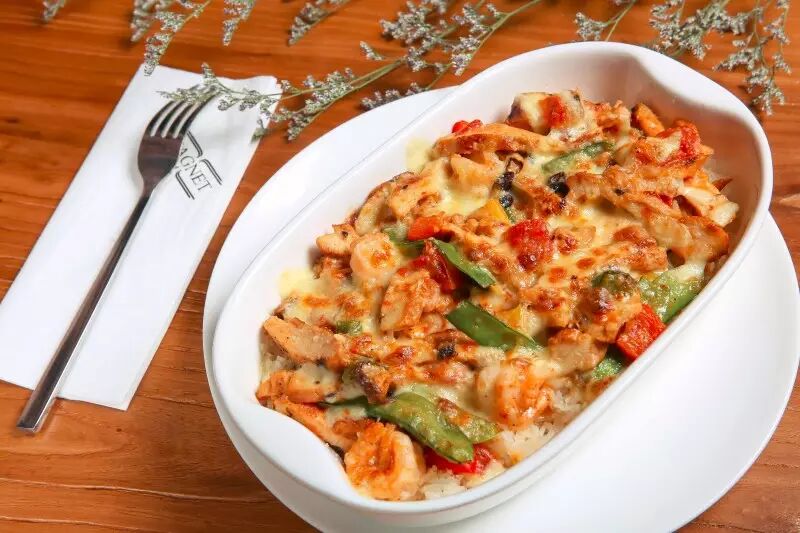 满满一整盆的芝士焗饭上桌,实在太有料了!超大个的虾仁、多汁的鸡肉再裹上香气浓郁的芝士.....简直是要人疯啊!!都别和我抢!