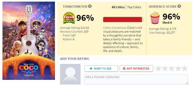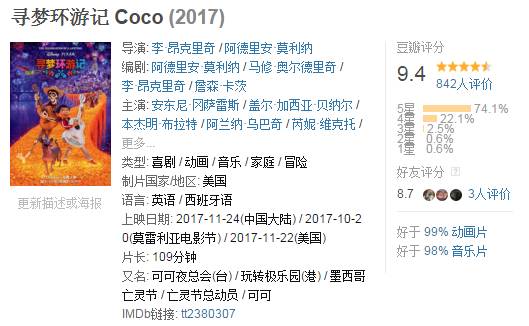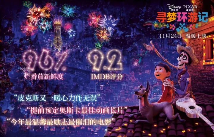 《寻梦环游记》自公开评分以来,一直位居高口碑评分之列。烂番茄新鲜度96%;IMDb9.2;豆瓣评分9.4,并且成绩还在一路飙升。
