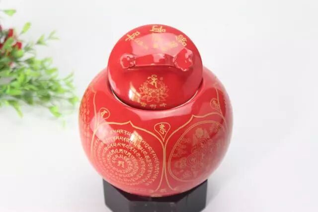 包装瓷器罐上采用中国红颜色,上有殊胜的咒语真言:
