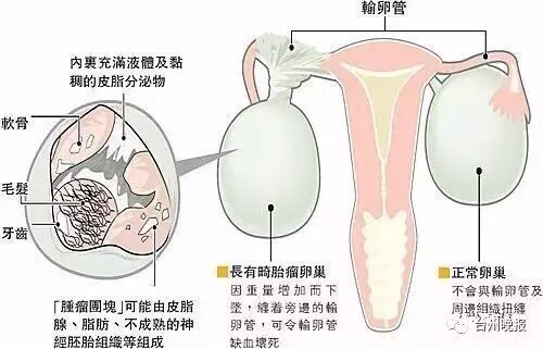 畸胎瘤是卵巢生殖细胞肿瘤中常见的一种,在各种类型的卵巢肿瘤里,当中包含有毛发、牙齿、骨骼和油脂的,被称为卵巢畸胎瘤。