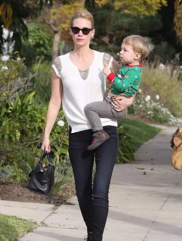 《广告狂人》女星詹纽瑞·琼斯(January Jones)抱着儿子Xander Jones 一同走在洛杉矶街头。这分明就是时尚广告的初稿嘛~