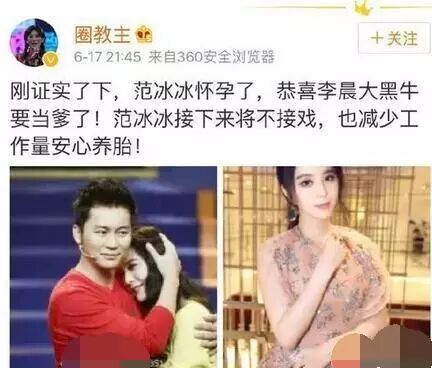 最近又有人报道了,又有网友爆料称“刚证实了下,范冰冰怀孕了,恭喜李晨黑牛要当爹了!范冰冰接下来将不接戏,也减少工作量安心养胎!”。