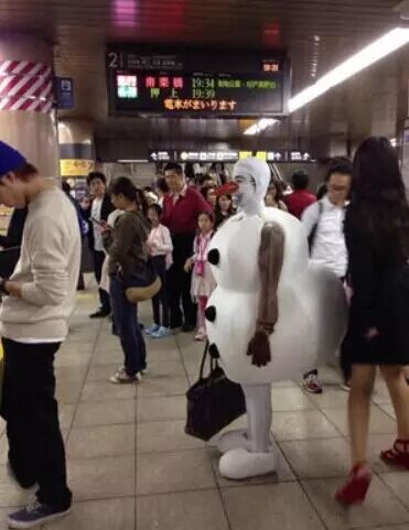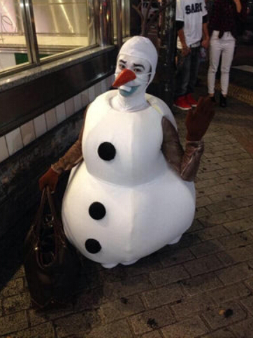 冬天到了,东京涉谷街头出现了小雪人造型的上班族,还拎着手提包呢!