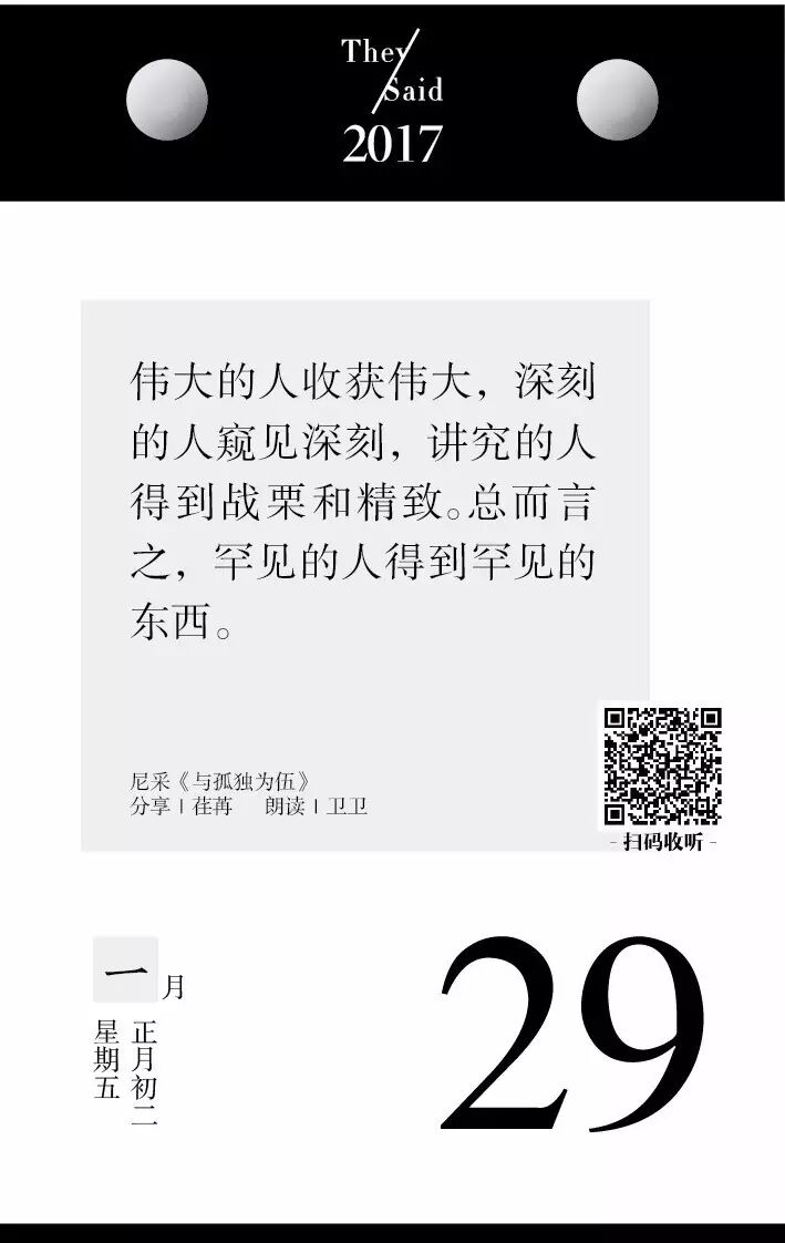 “对于我们平凡人而言,生命中许多微细小事,并没有什么特别缘故地就在心深处留下印记,天长日久便成为弥足珍贵的回忆。”一年的365天,每一天我都为你准备了不一样的经典,不一样的声音。我想就这样陪着你,无论春夏秋冬月盈圆缺。看着你一天一天,变成自己想要的样子,变成越来越优秀的你。