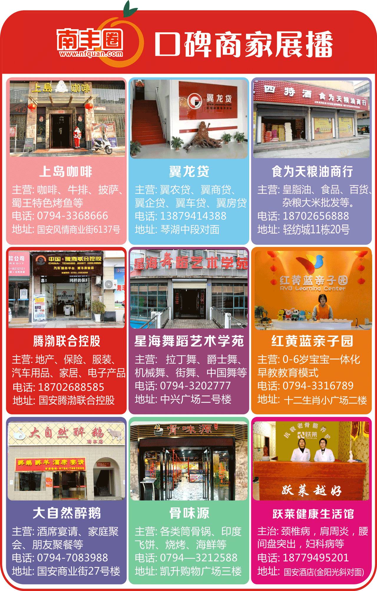 2、南丰圈、南丰·一品售楼部、玛雅新派婚纱摄影、杂草影视工作室(佳佳有喜)、江西亿源红电子商务有限公司(南丰电商创业园)、南丰万达国际旅行社、三只耳农家土菜馆、放生·清吧、南丰味美滋蛋糕