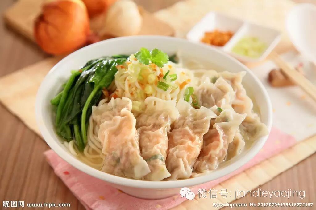 虾仁小馄饨+五谷饮+鸡蛋皮拌菠菜。