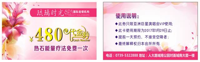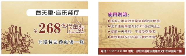 凡是凭演唱会门票提前入场的前10000名观众,将获得由【春天里音乐餐厅】和【琉璃时光SPA国际连锁机构】送出的超值礼品卡(见上图)。