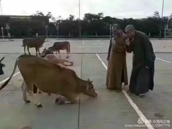 2013年7月22日海涛法师在台湾金门岛救了二十头黄牛,其中一头已怀孕的母牛居然跪下来向师父谢恩,师父离开了,母牛马上起身。