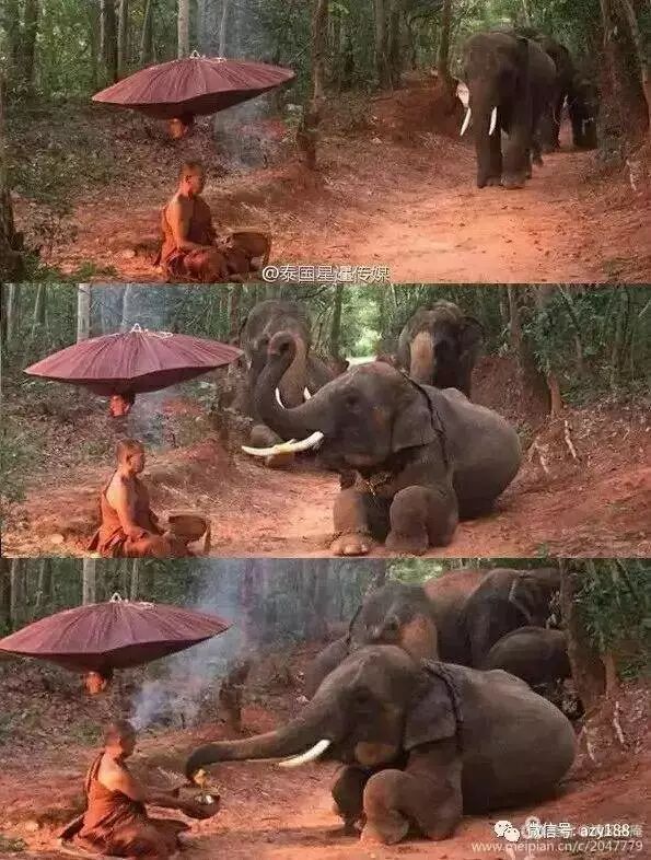 泰国大象跪拜佛门大师:数头大象沿着森林的林间小道行走,经过一位僧侣盘坐的地方时,这群大象并没有绕道或者逃走,而是在僧侣面前呈半跪的姿势,并利用鼻子将物品放入僧侣的化缘金钵中。