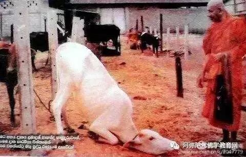 白牛下跪摄于2008年,在斯里兰卡一家寺院的一位僧人,在屠宰场买下几头待宰杀的牛,其中一头从屠宰场救出的小奶牛当场给僧人下跪感恩!